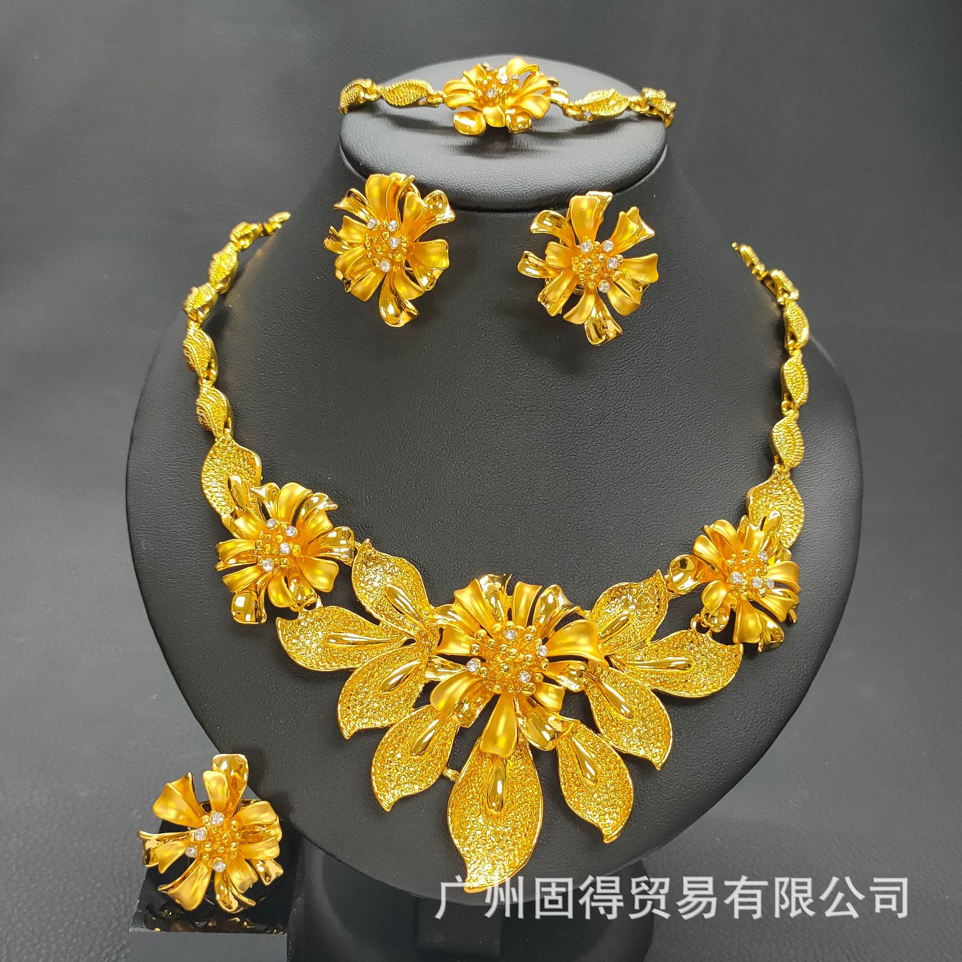 Cross-Border 24k gold Dubai bridal necklace earrings bracelet ring jewelry suit flower alloy jewelry four-piece set