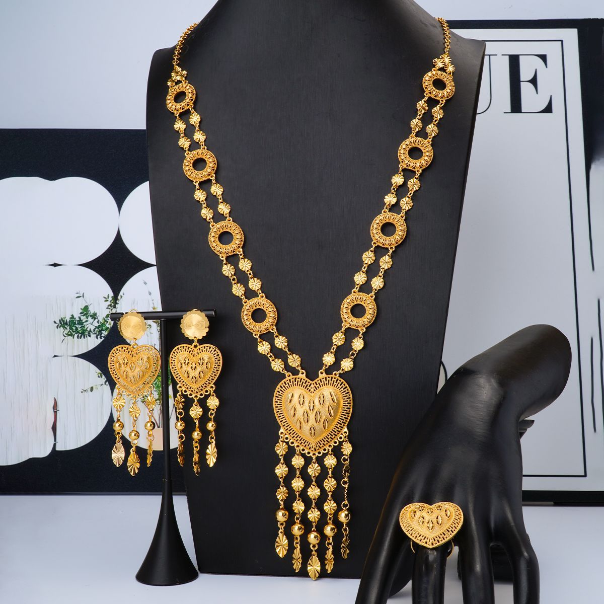 3-Piece Set of Middle Eastern 24K Gold-Plated Flower Heart Necklace, Earrings, and Ring Jewelry Set, Dubai European and American Wedding Jewelry