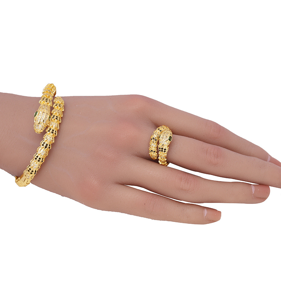 Copper Plated 14K Gold Yellow Blue Zircon SnaKe Bangle Ring Set Dubai Women Bridal Wedding Accessories