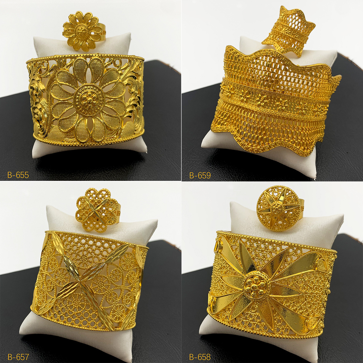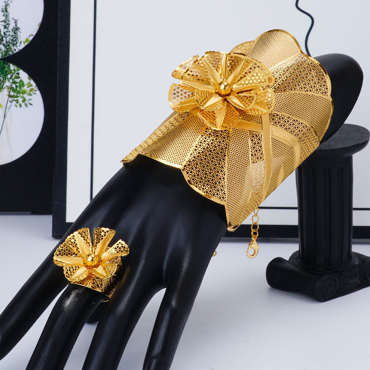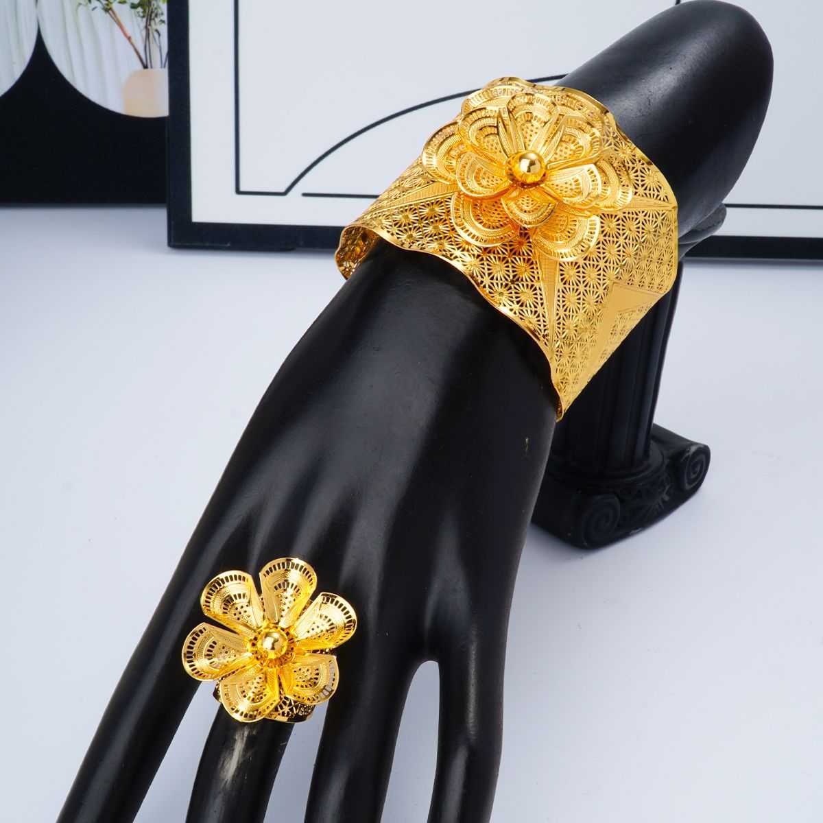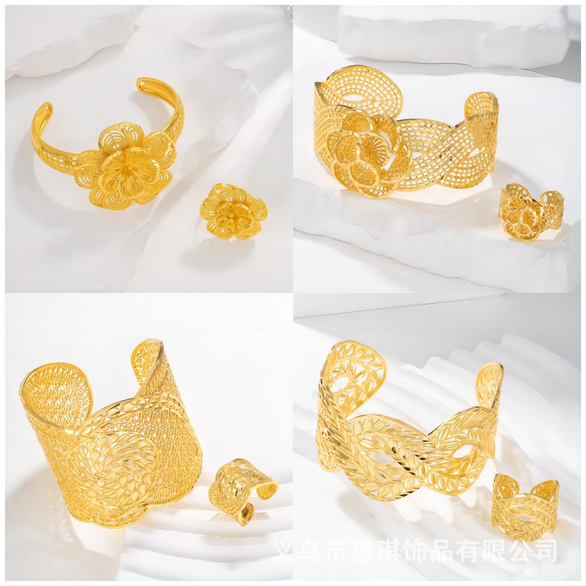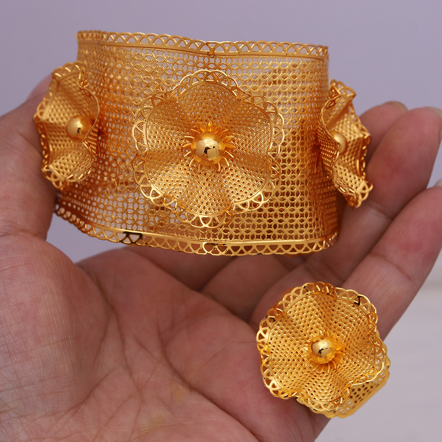 Cross-border Cut Out Flower C-shaped Open Bracelet Ring Jewelry Set 24k Gold Middle East Dubai Bride Wedding Hand Jewelry