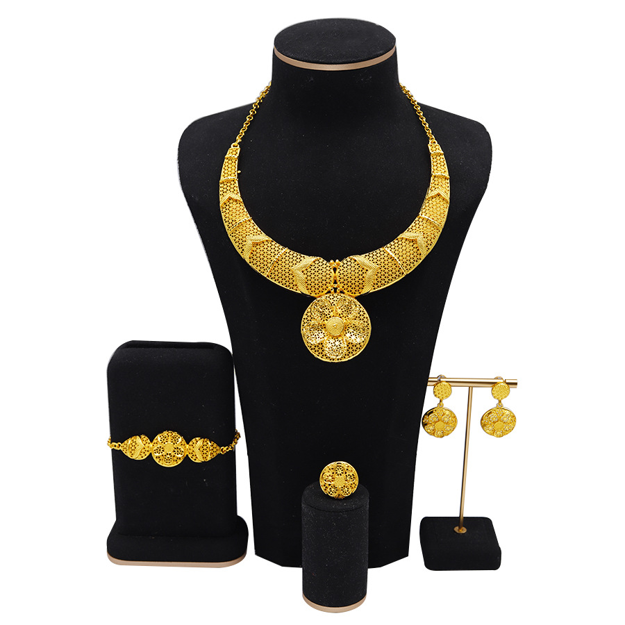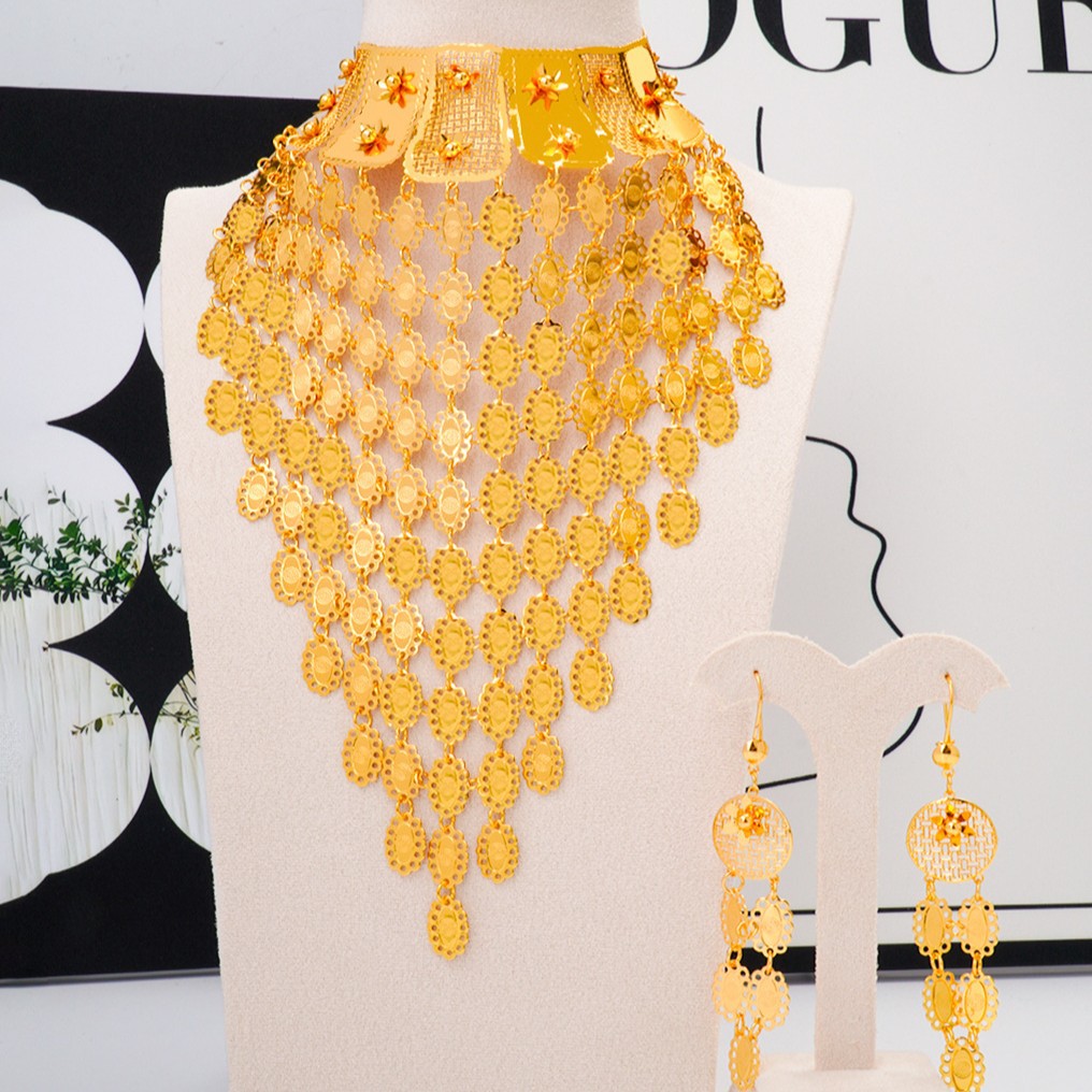 Cross-Border Popular Dubai Middle Eastern Gold-Plated Copper Necklace and Earrings Hollow Gold Set Indian Bride Wedding Set