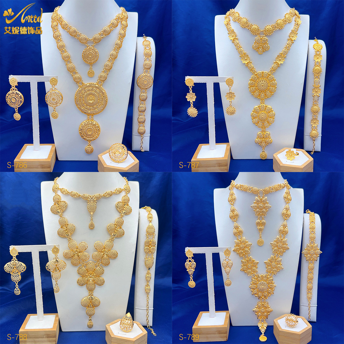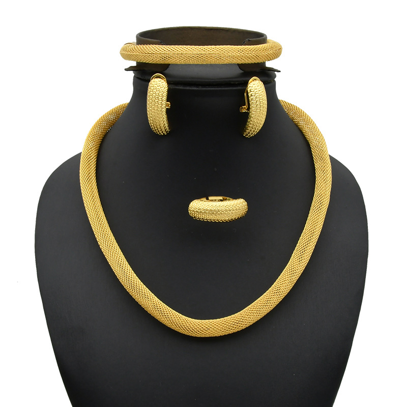 New 24K Gold-Plated Long Necklace, Earrings, Bracelet, Ring Jewelry Set, Dubai Jewelry, Bridal Sand Gold Wholesale
