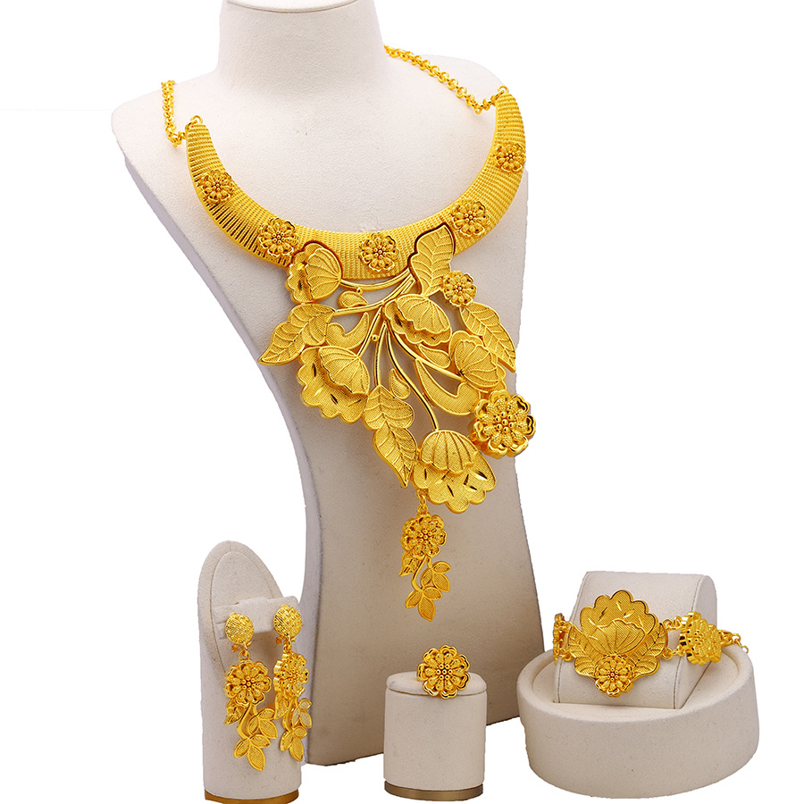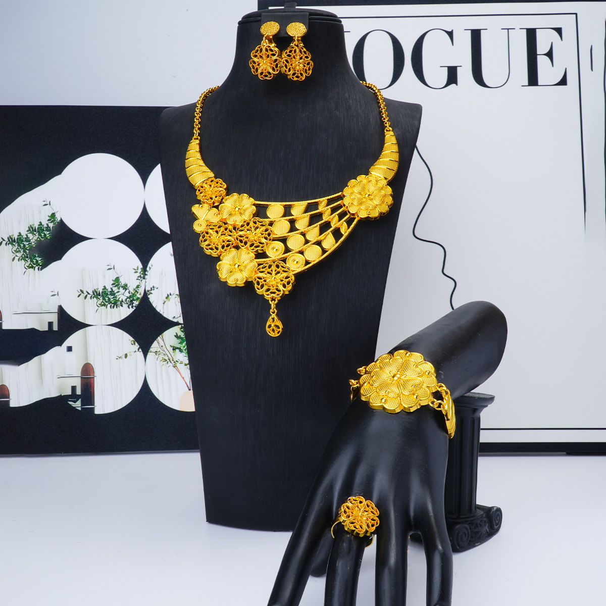 Middle Eastern Dubai Style 24K Gold-Plated Flower Necklace Earrings Bracelet Ring Four-Piece Set Bridal Wedding Exaggerated Jewelry