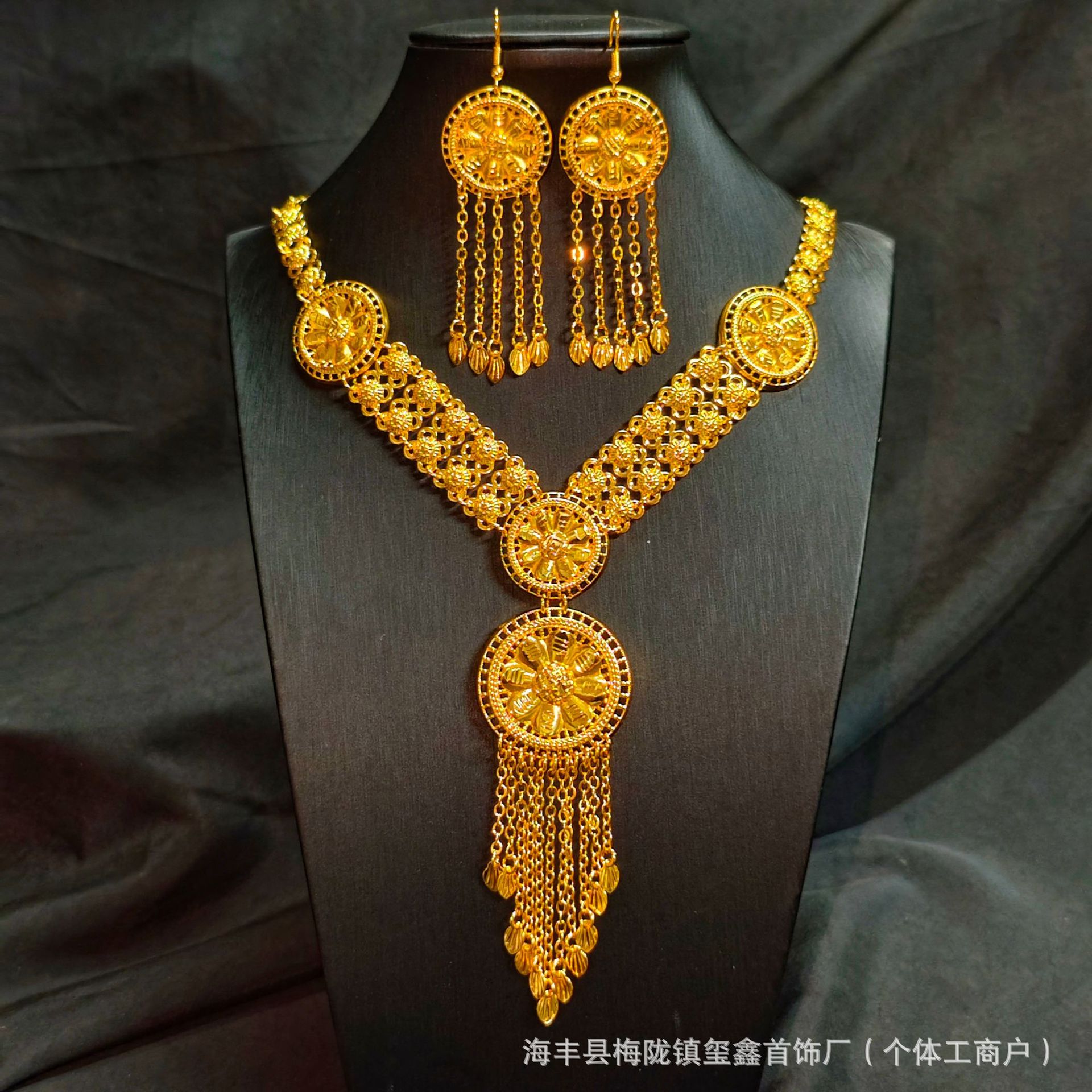 Cross Border 24K Gold Plated Bridal Necklace Earrings Two Piece Set India Dubai Jewelry Drop Shaped Sand Gold Jewelry suit