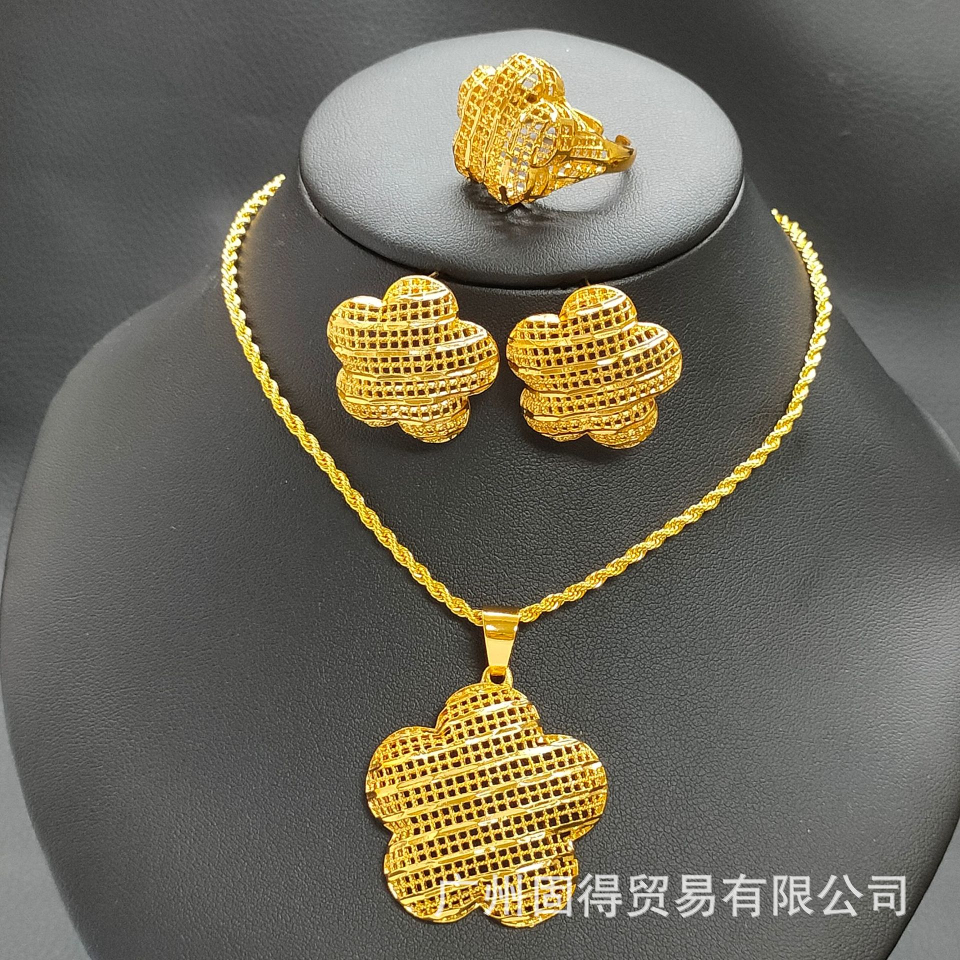 Dubai 24K Cut Out Flower Jewelry Set Pendant Earrings Ring Jewelry Three-Piece Set Ethnic Style Sand Gold Jewelry