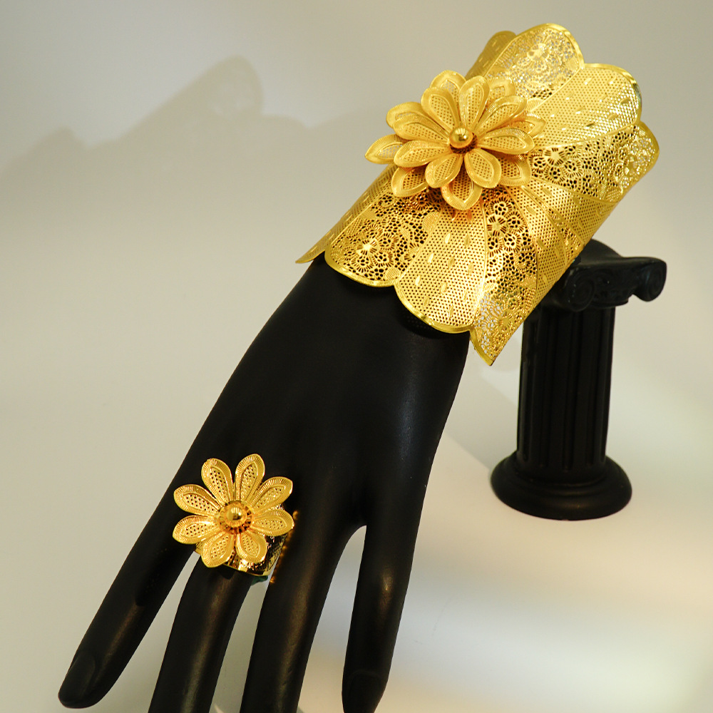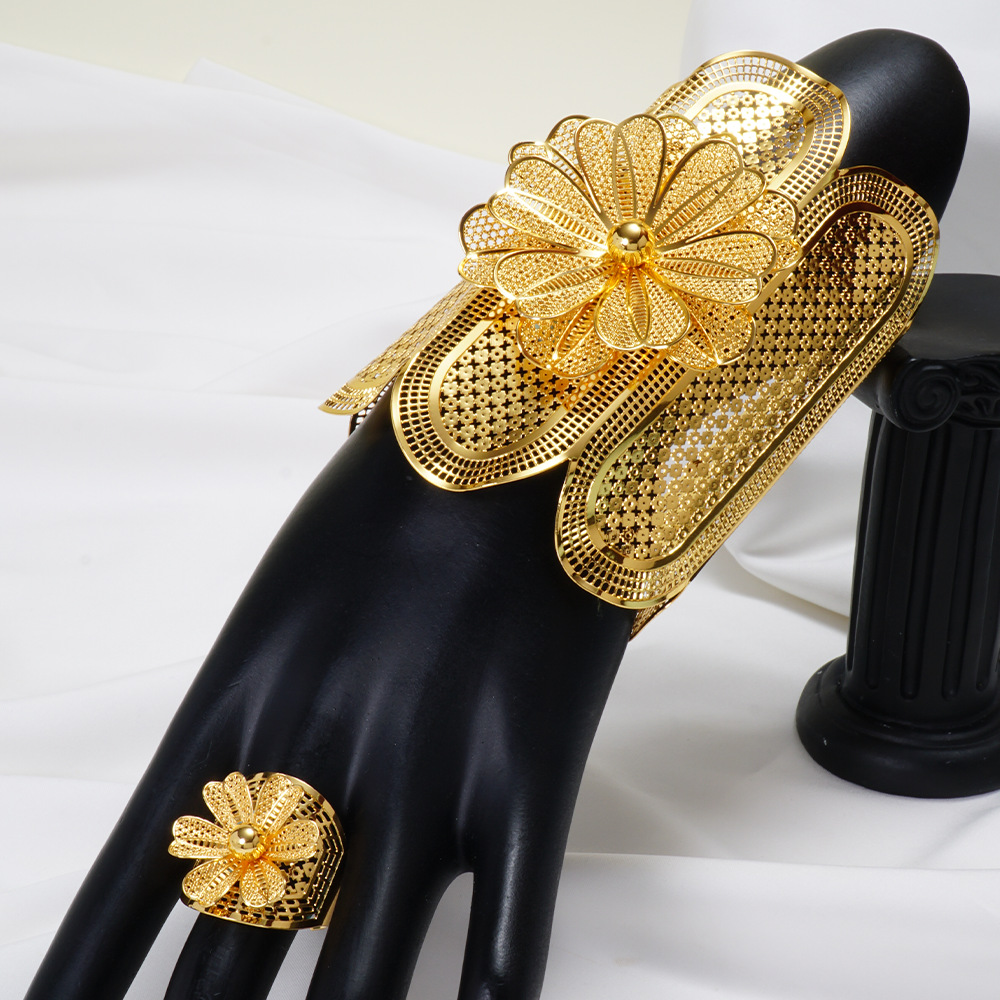 Dubai 24K Gold-Plated Bridal Bracelet and Ring Set Middle Eastern Wedding Holiday Jewelry Light Luxury Style Floral Design