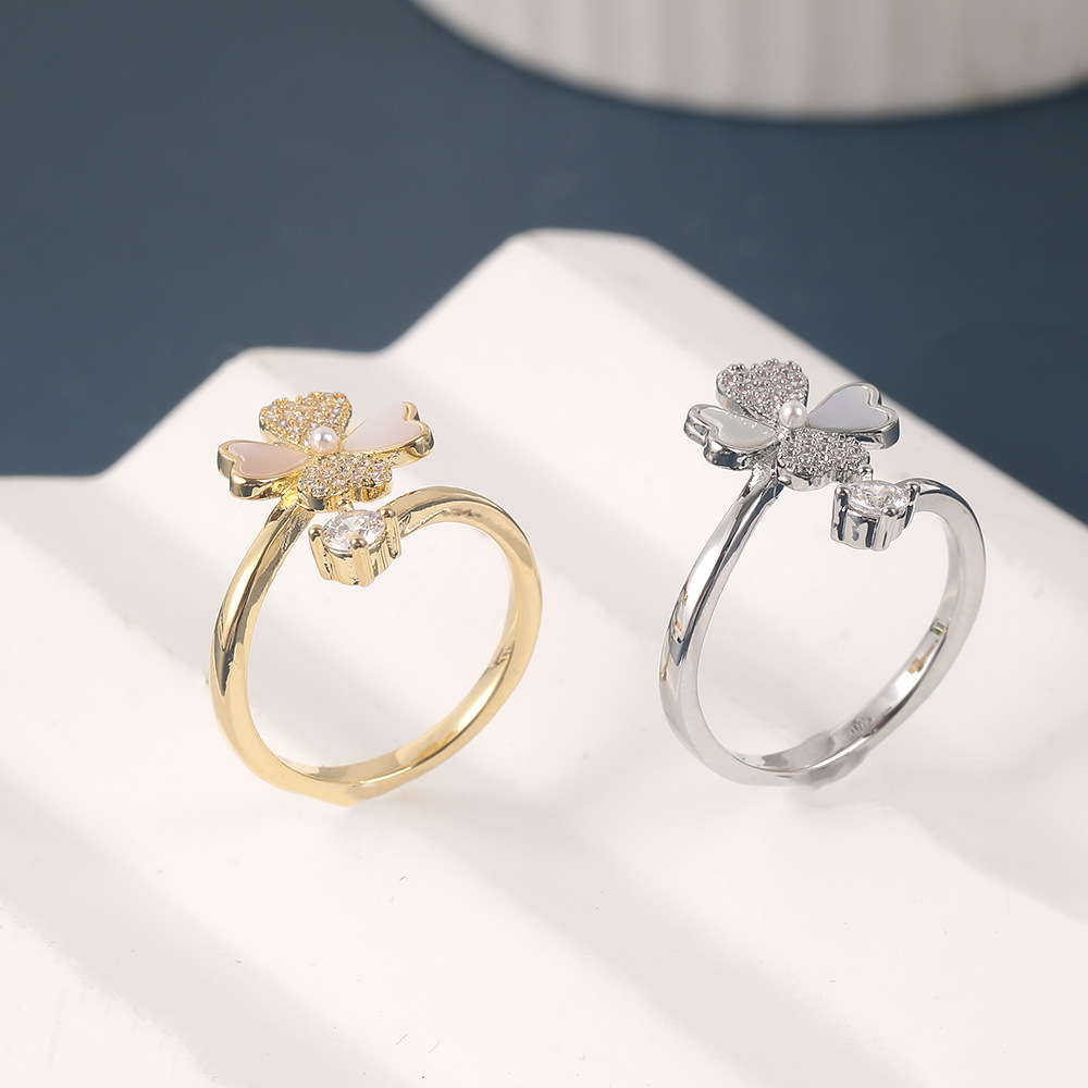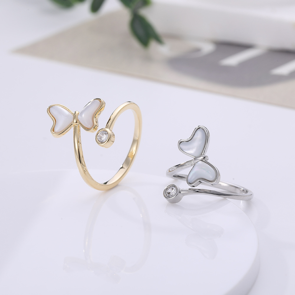Natural White Fritillaria Zircon Butterfly Ring Opening Adjustable Dieting Finger Ring Cross-border Hot Selling Simple Three-dimensional Jewelry