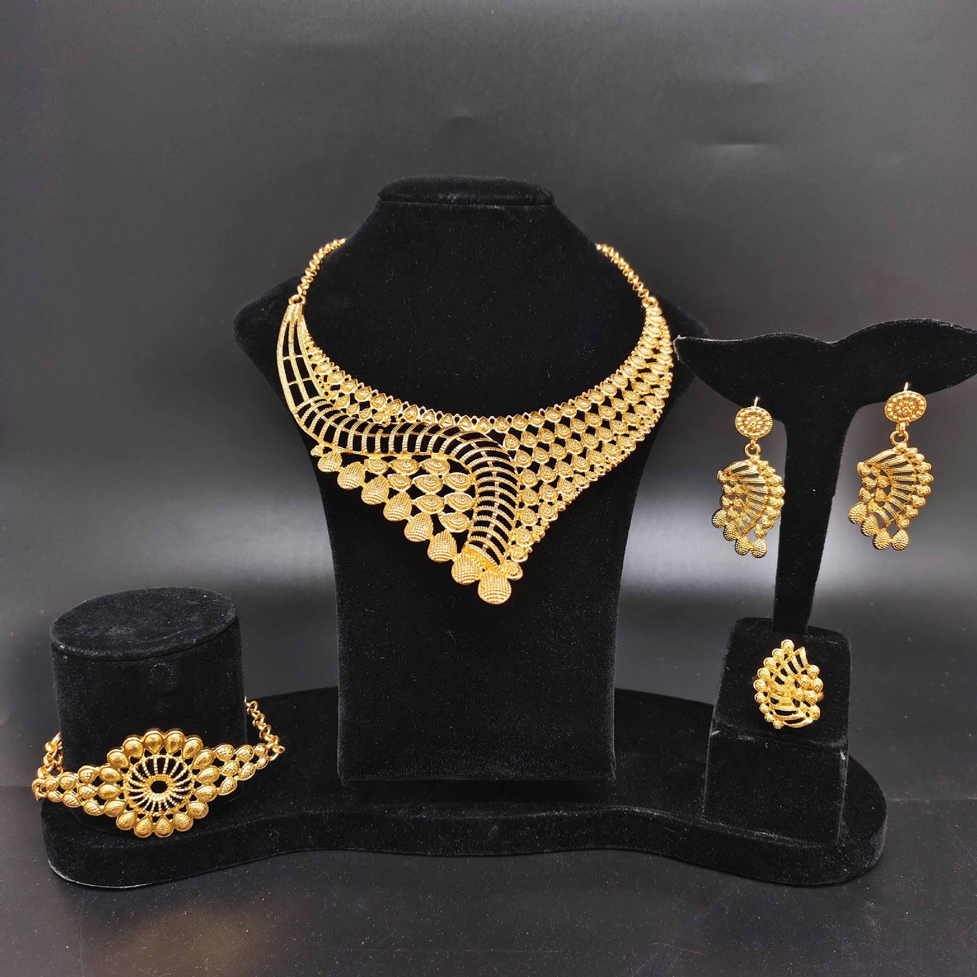 Cross-Border Dubai Indian Bride Champagne Gold-Plated Jewelry Four-Piece Set Women's Necklace Bracelet Earrings Ring Set Accessories