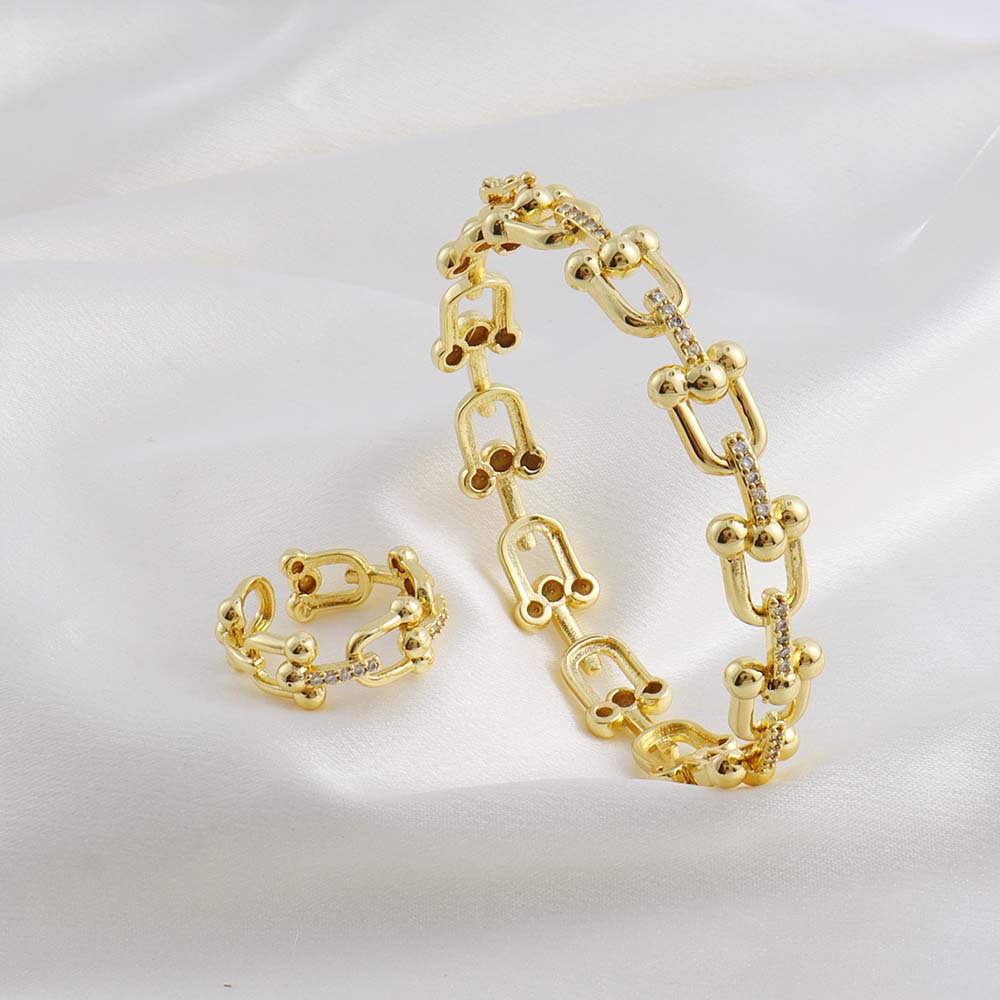 European and American Cross-border Two-piece Set of Real Gold-plated Copper Micro-inlaid Zircon Opening Bracelet Ring Dubai Women's All-match Jewelry