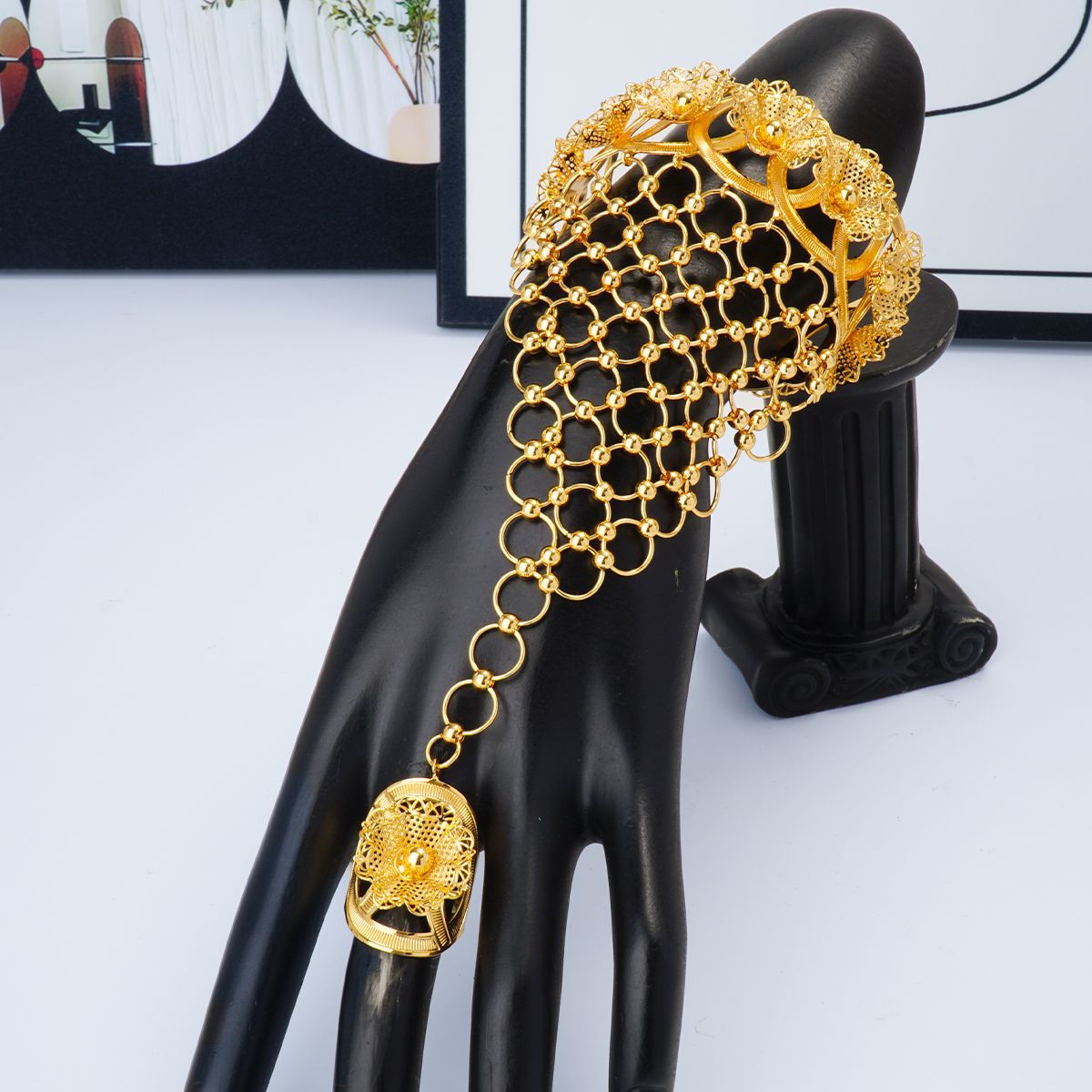 Middle East Cross-Border 24K Gold Plated Cut Out Flower Bracelet Ring One-Piece Chain Dubai Women's Bridal Wedding Jewelry