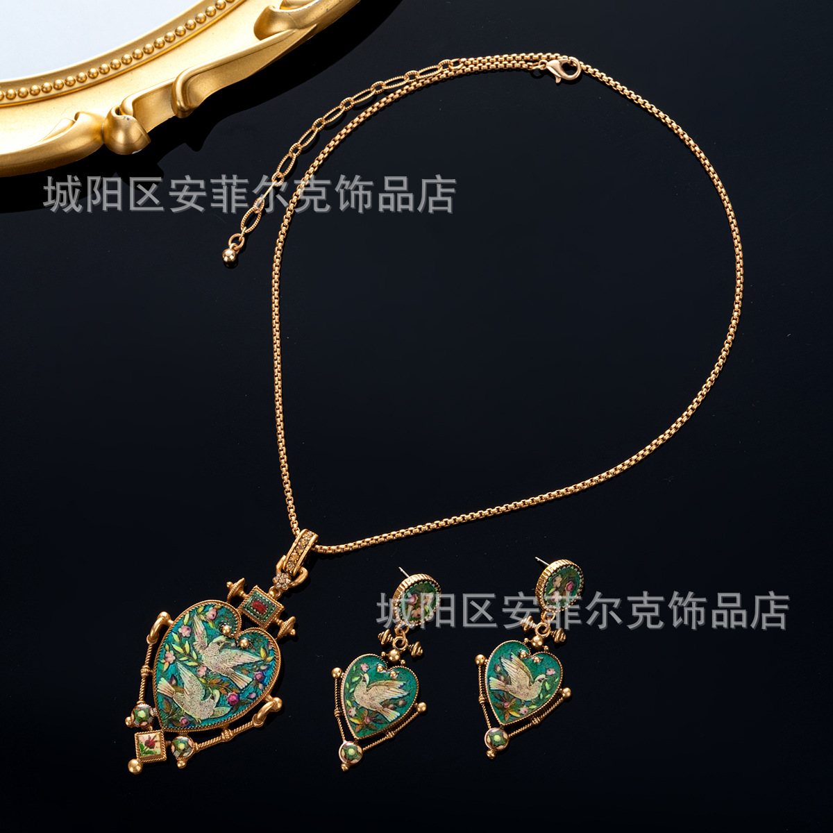 Qingdao Vintage European and American Retro Dove Print Necklace Earrings Palace Style Green Heart Necklace Set