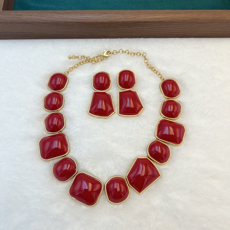 Middle Ancient vintage Flowers with Red Vintage Atmospheric Necklace Earrings suit