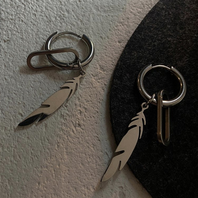 Feather Titanium Steel Earrings for Men, Niche Stylish Hip-Hop Earrings for Women, Cool Style, Simple Ins Non-Fading Jewelry