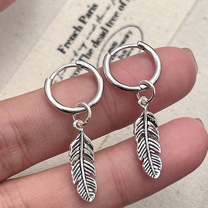 Vintage Old Feather Earrings Women's 925 Silver Plated Ear Cool Girl Hole Ear Ring Men's Neutral Style Ins Earrings Accessories
