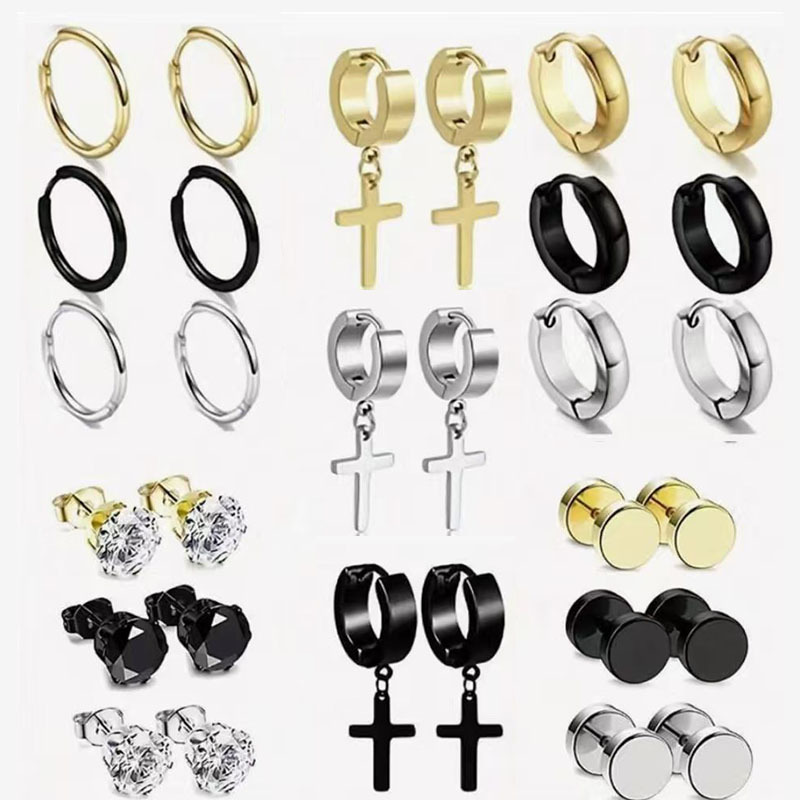 Amazon Trendy Men's Stainless Steel Earring Set Personalized Fashion Zircon Cross Earrings Ear Clip Set