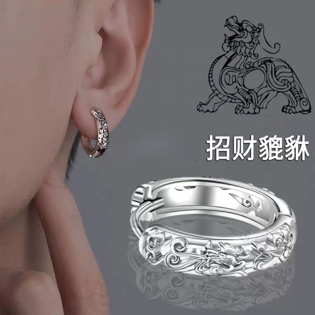 Sterling Silver Fortune-Attracting Pixiu Earrings Studs for Men, Chinese Style Single High-End Niche Design, New Ins Fashion