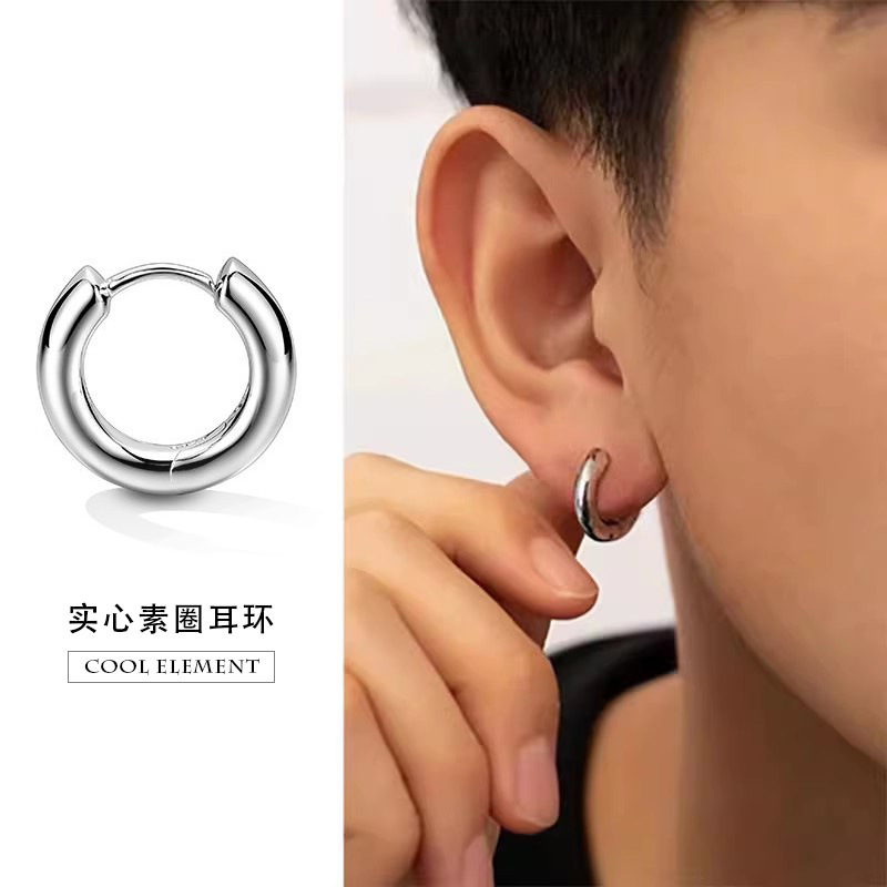 S925 sterling silver and coarse plain hoop earrings for boys European and American trendy personalized earrings solid high-grade texture round ear buckle
