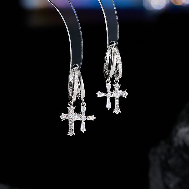 Men's Asymmetric Double-Layer Cross Earrings Trendy Personality Zircon Hoop Earrings