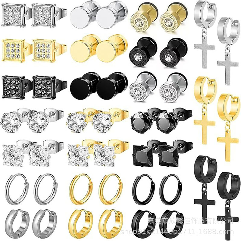 Cross-Border Model 24 Pieces 24-Piece Stainless Steel Earrings and Studs Mixed Color Set Suitable for Men and Women Earrings Wholesale