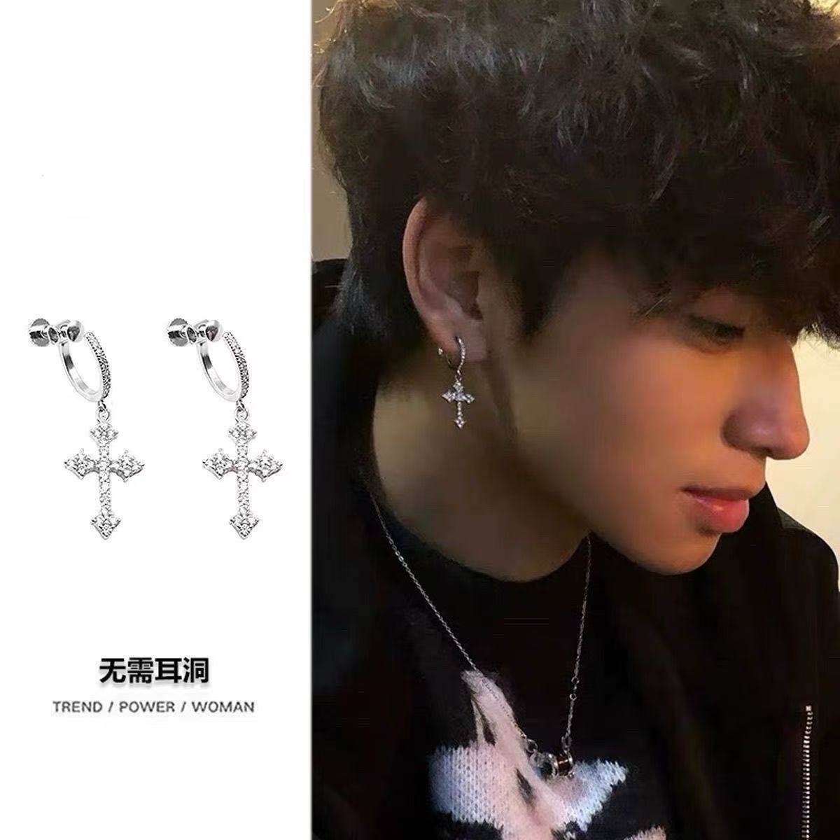 European and American Full Diamond Cross Screw Non-Pierced Ear Clip Men's Trendy High-End Zircon Ear Buckle Hip-Hop Style Handsome Earrings