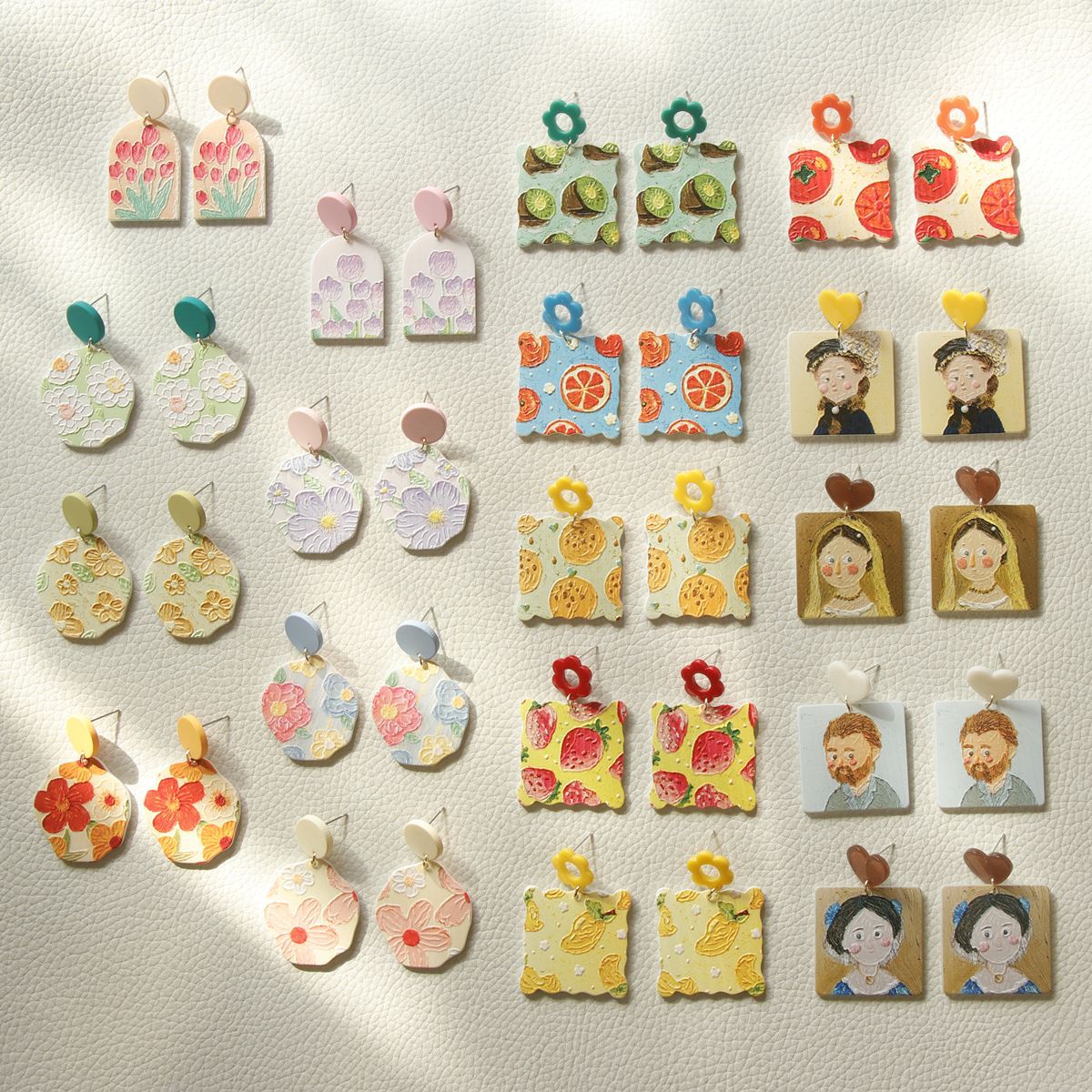 Fashionable Girl Cartoon Oil Painting Fruit Printing Cute Kidsren's Acrylic Earrings Lace Geometric Ins Style Earrings