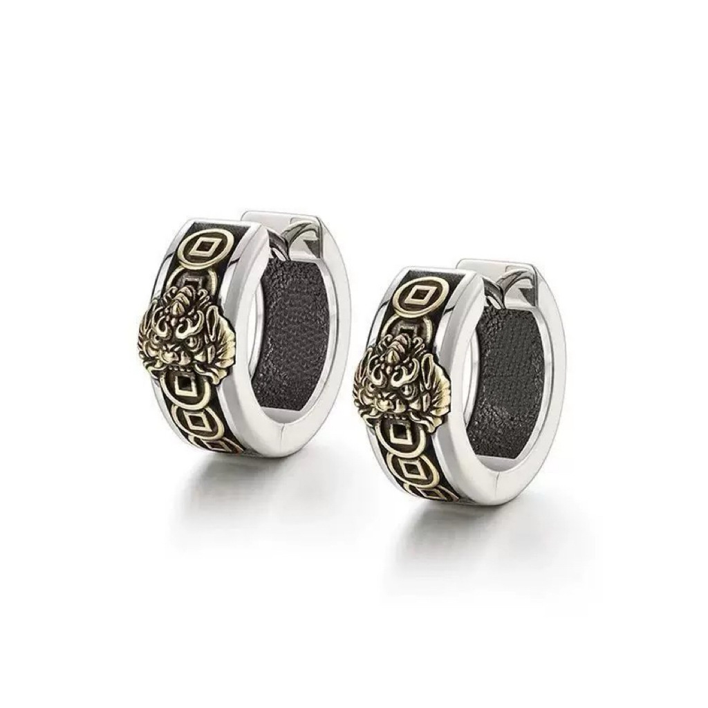 Vintage Lucky Pixiu Earrings for Men Trendy Personality Minimalist Fashion Creative Thai Silver Coin Ear Clips