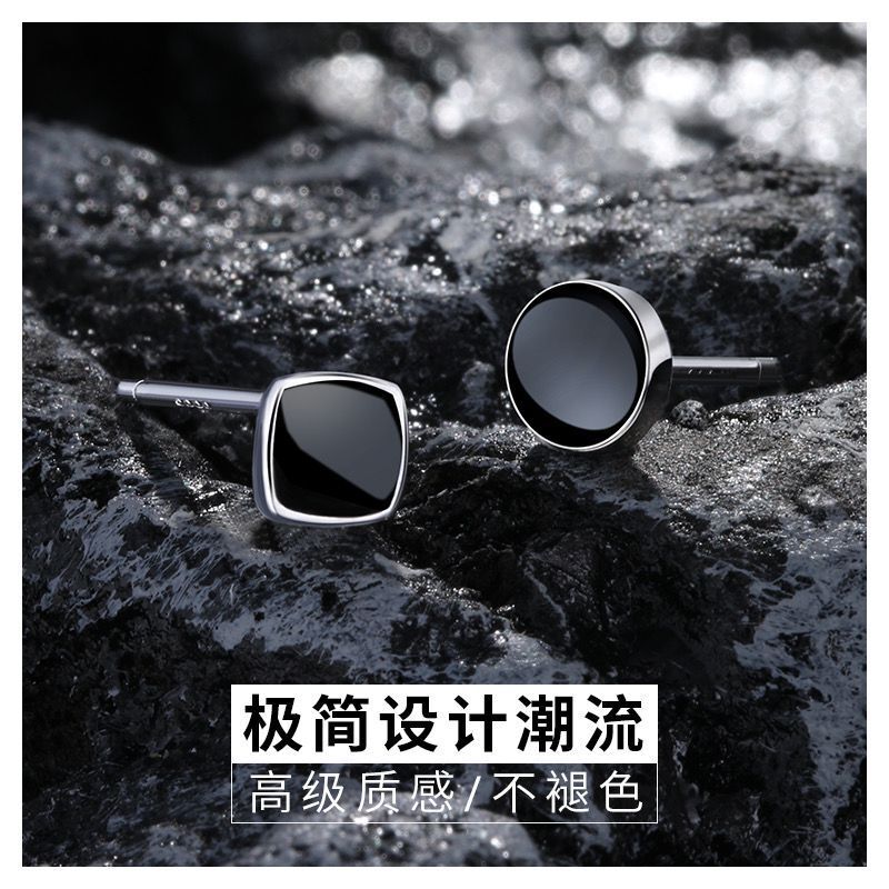 Silver stud earrings S925 sterling silver men's high-grade black square Men's pure silver simple ear piercing ear stick silver needle ear jewelry
