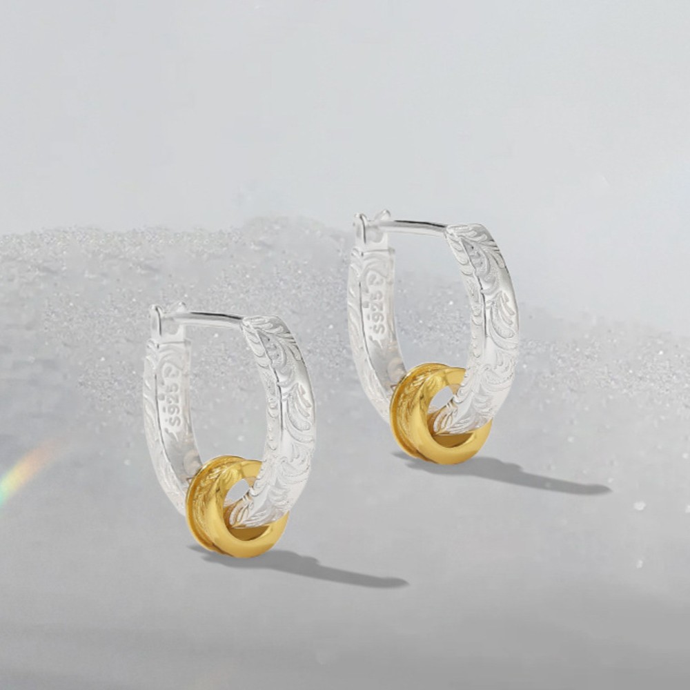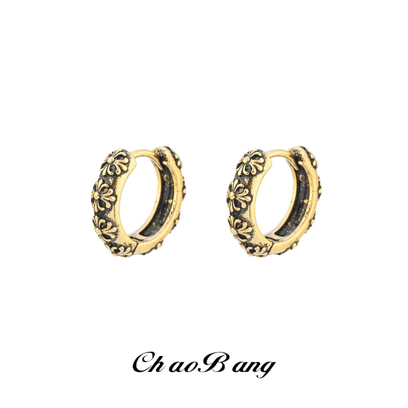 Silver Needle Earrings Men's Light Luxury High-end Niche Design Tang Grass Pattern Golden Circle Ear Buckle Single Trendy Men's Earrings