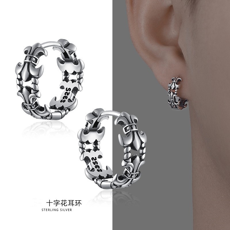 Silver-Plated Earrings for Men, High-End Vintage Style, Unique Hollow Cross Design, Single Ear Hoop