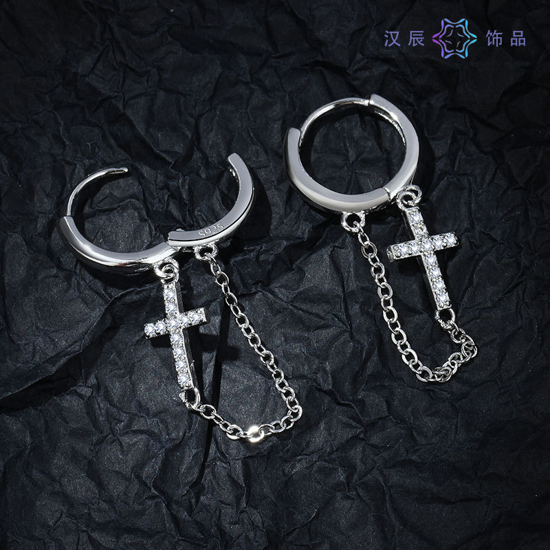 Cross Earrings for Men with Diamond Chain Tassels, High-End Versatile Niche Accessories, Women's Hip-Hop Simple Jewelry Earrings