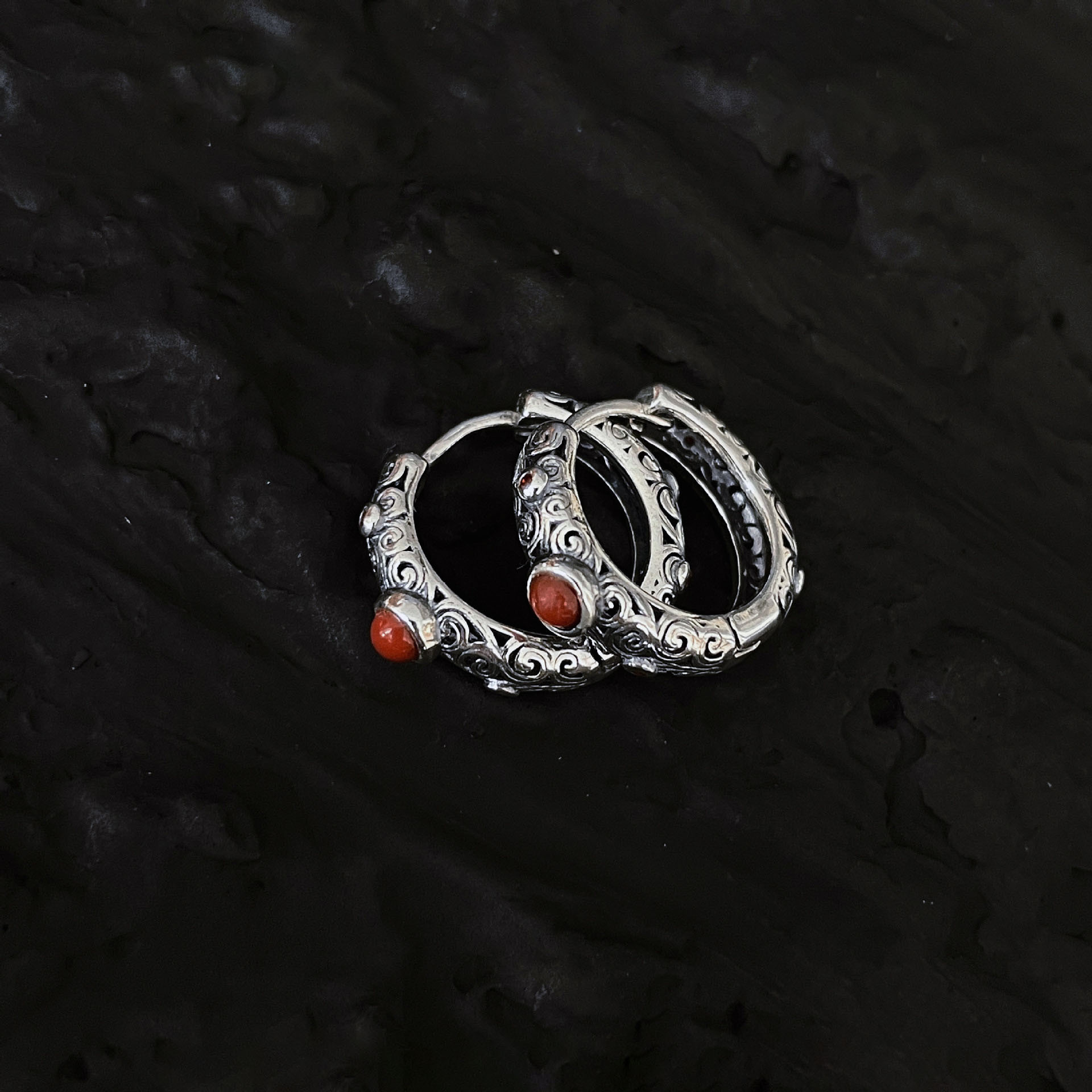 Retro pattern hollow inlaid earrings men's and women's niche design earrings ethnic ancient Tang grass pattern Red Bean ear buckle