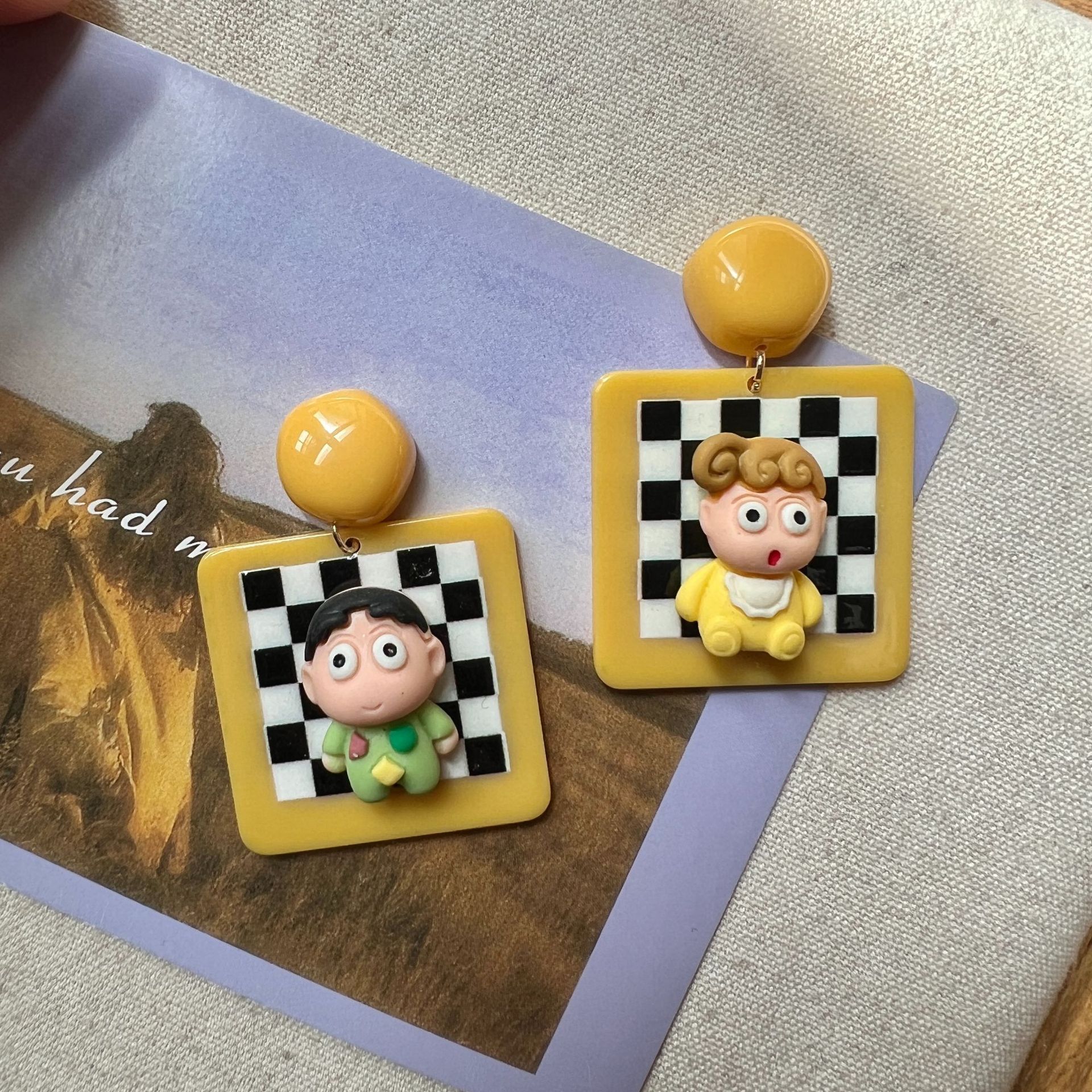 Cute Black and White Checkerboard Earrings Yellow Unique Design Sense Little Boy Little Girl Earrings Ear Clip Earrings