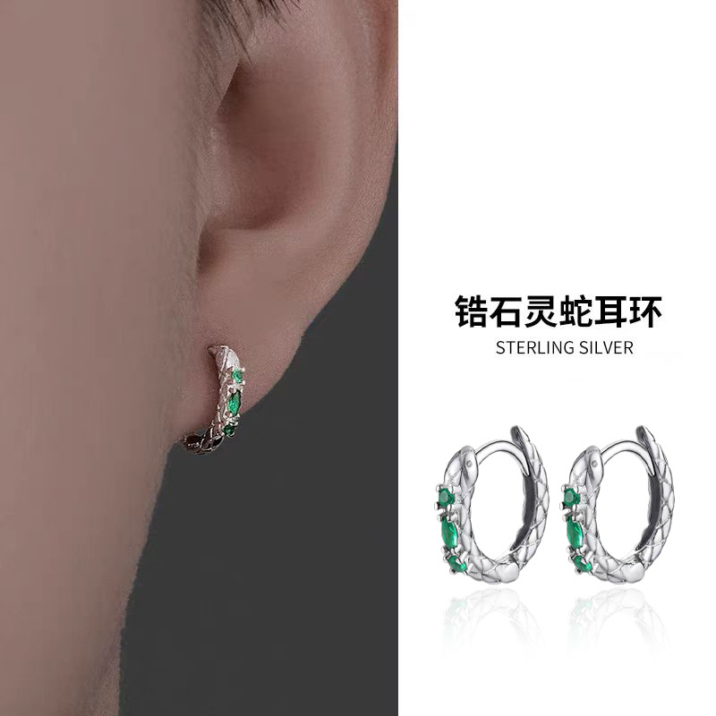 S925 Sterling Silver Earrings Men's High-end Sense Green Zircon Snake Ear Buckle Cold Style Personalized Design Earrings for Boys