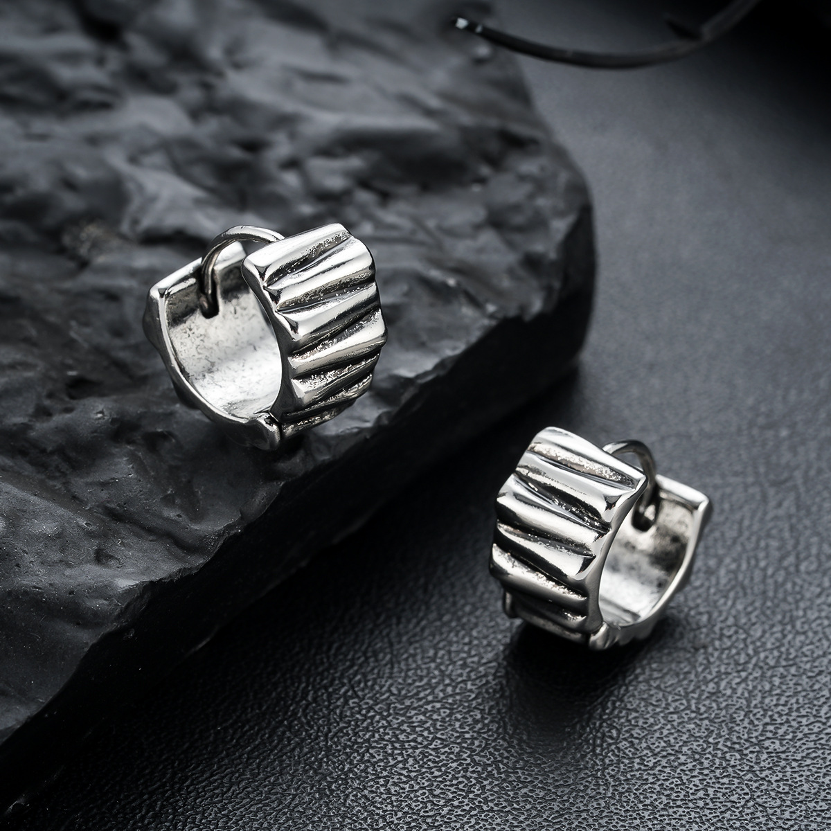 Stainless Steel Men's Earrings, Korean Style, Simple, Personalized, Fashionable, Engraved Round Earrings with Concave and Convex Hammer Pattern Eh-552