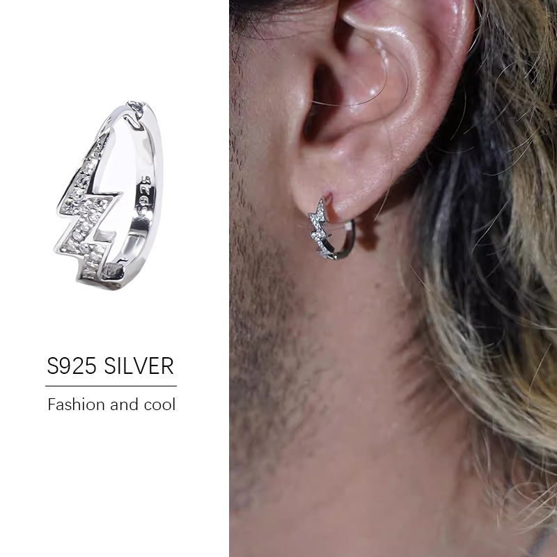 s925 sterling silver lightning diamond ear buckle men's European and American style street couple men's pair of trendy cool diamond single earrings