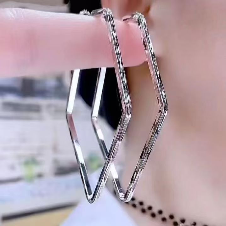 European and American Style Rhombus Hoop Earrings for Women, High-End, Simple, Silver Needle Earrings, Cool Style, Niche Trend