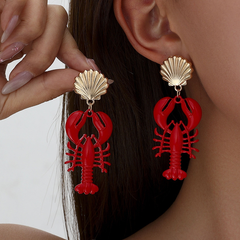 Cross-border Hot Sale Marine Life Series Red Paint Lobster Earrings Metal Shell Earrings Women Wear Earrings