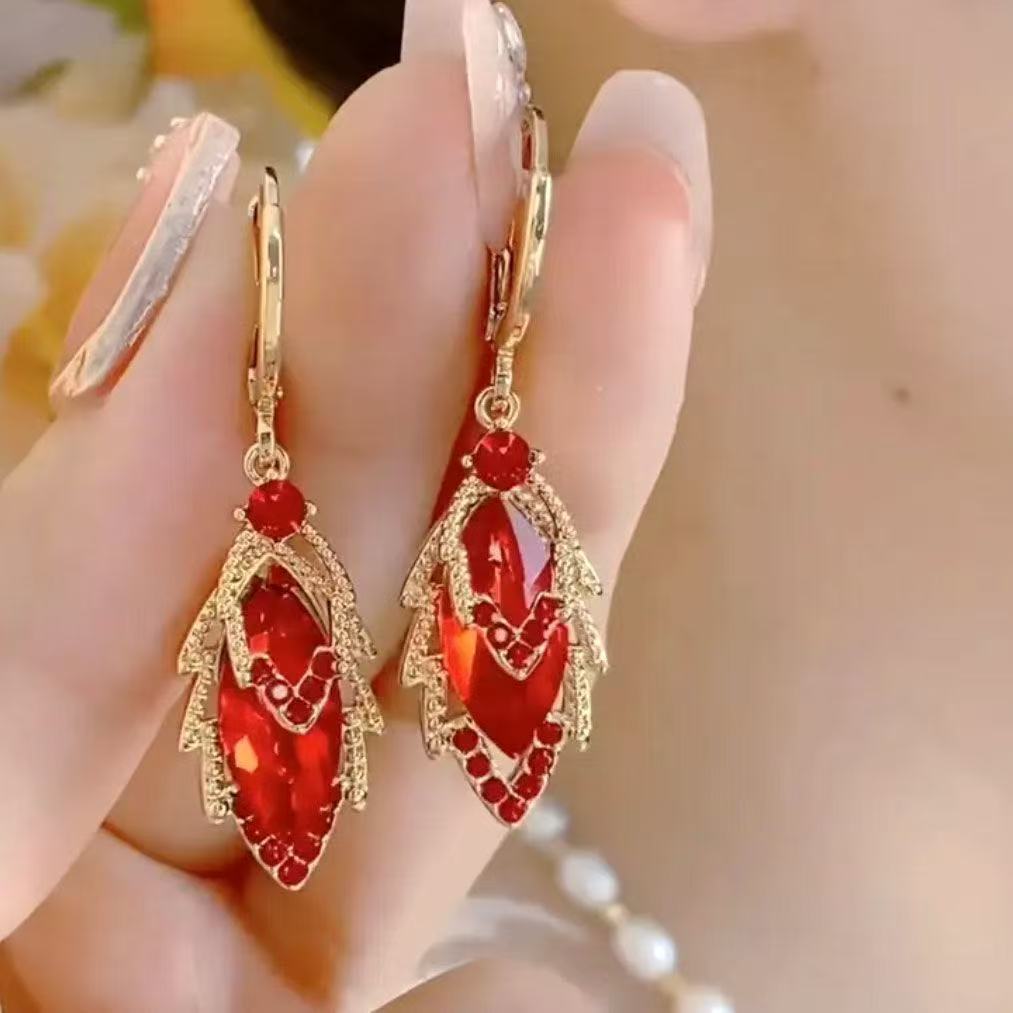 Elegant Red Rhinestone Leaf Earrings, Fashionable and High-End Gold Leaf Earrings for Women, Simple and Versatile Earrings