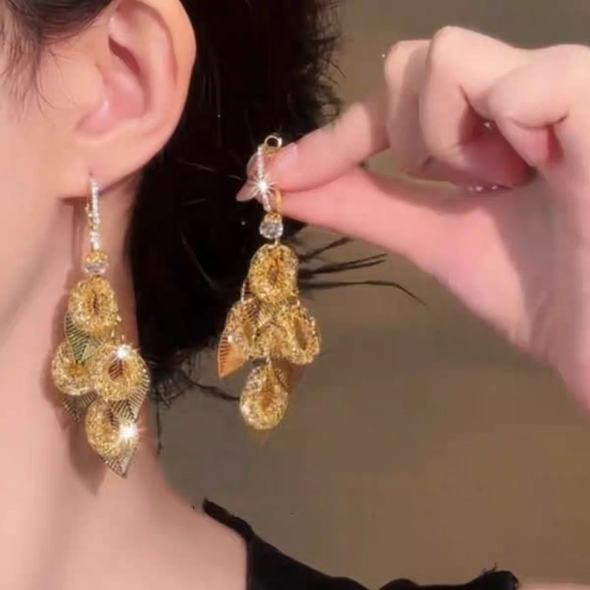 Retro European and American Style Twilight Echo Golden Tassel Zircon Earrings Women's Niche Design Luxury Long Leaf Earrings