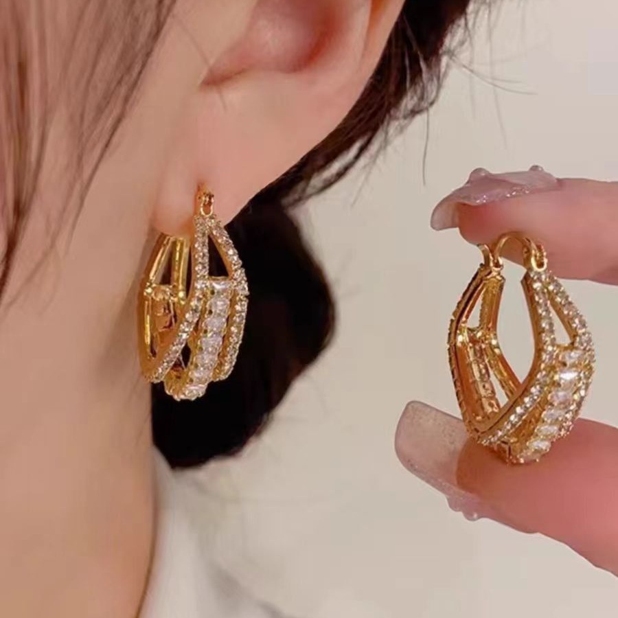 Fashionable elegant three-layer micro inlaid zircon earrings women's geometric square earrings ear buckle personalized cold wind Net red earrings