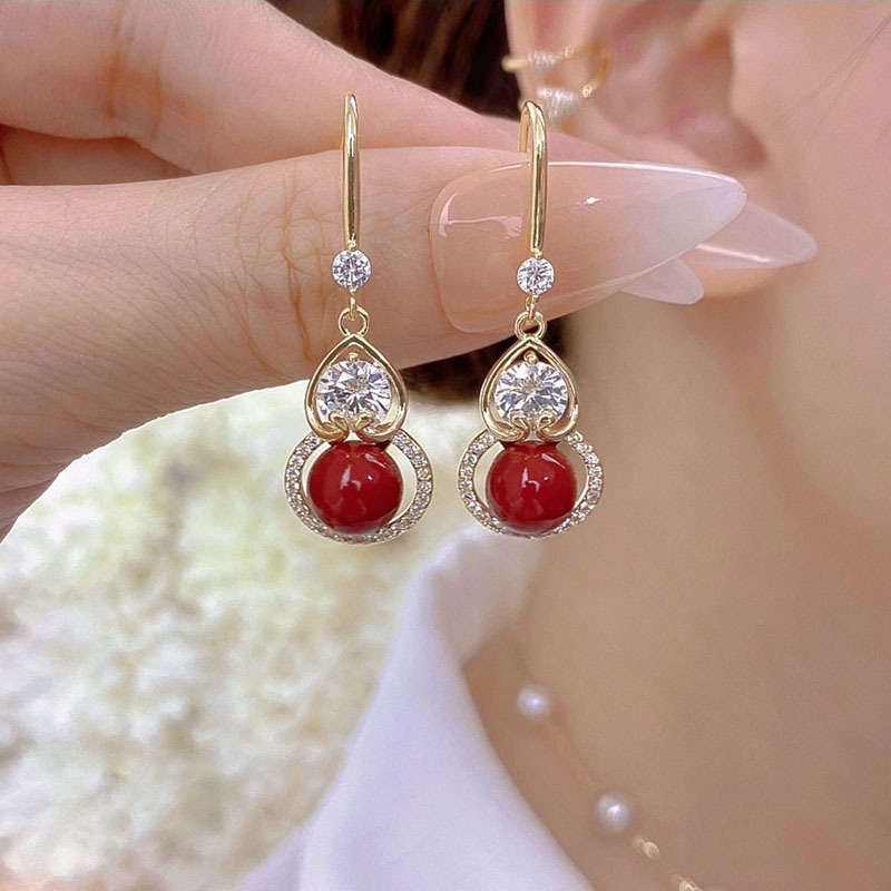 2024 New Chinese style retro red pearl diamond gourd zircon earrings women's high-grade festive earrings