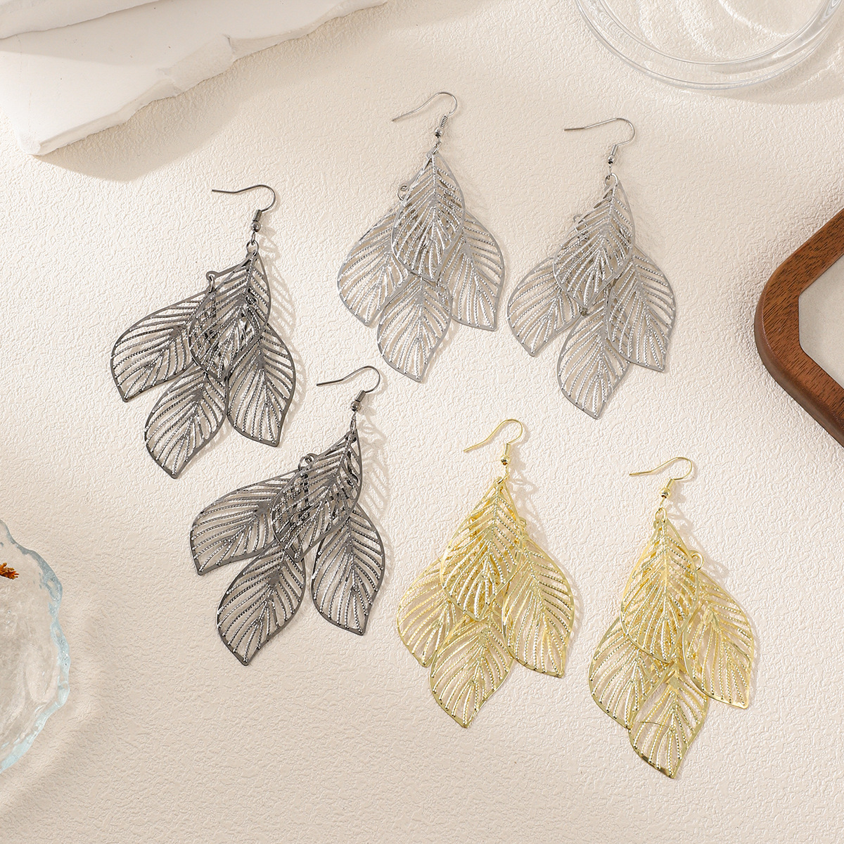Cross-border European and American Hollow Leaves Tassel Long Earrings Earrings Gold Metal Fashion Women's Elegant Atmosphere High-end Sense