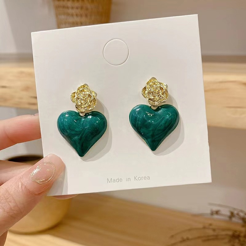 Japanese and Korean style super fairy temperament green oil drop love earrings women's retro personality fashion OL rose earrings wholesale