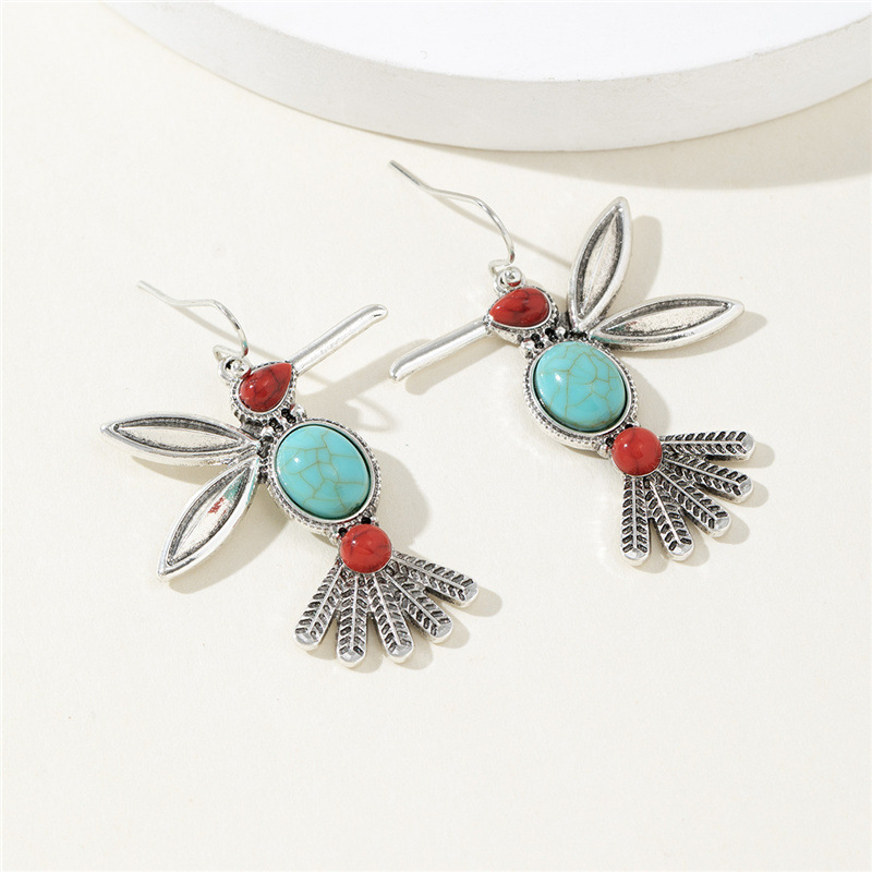 Bohemian Personality Bird Two-Color Red Turquoise Pendant Earrings Creative Ladies Retro Earrings Wholesale