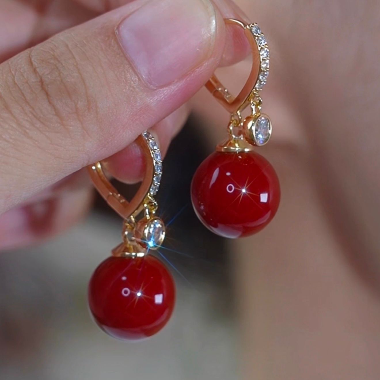 High-end French-style Red Pearl Ear Buckle Women's Light Luxury All-match Smart Diamond Earrings Elegant Fashion New Earrings