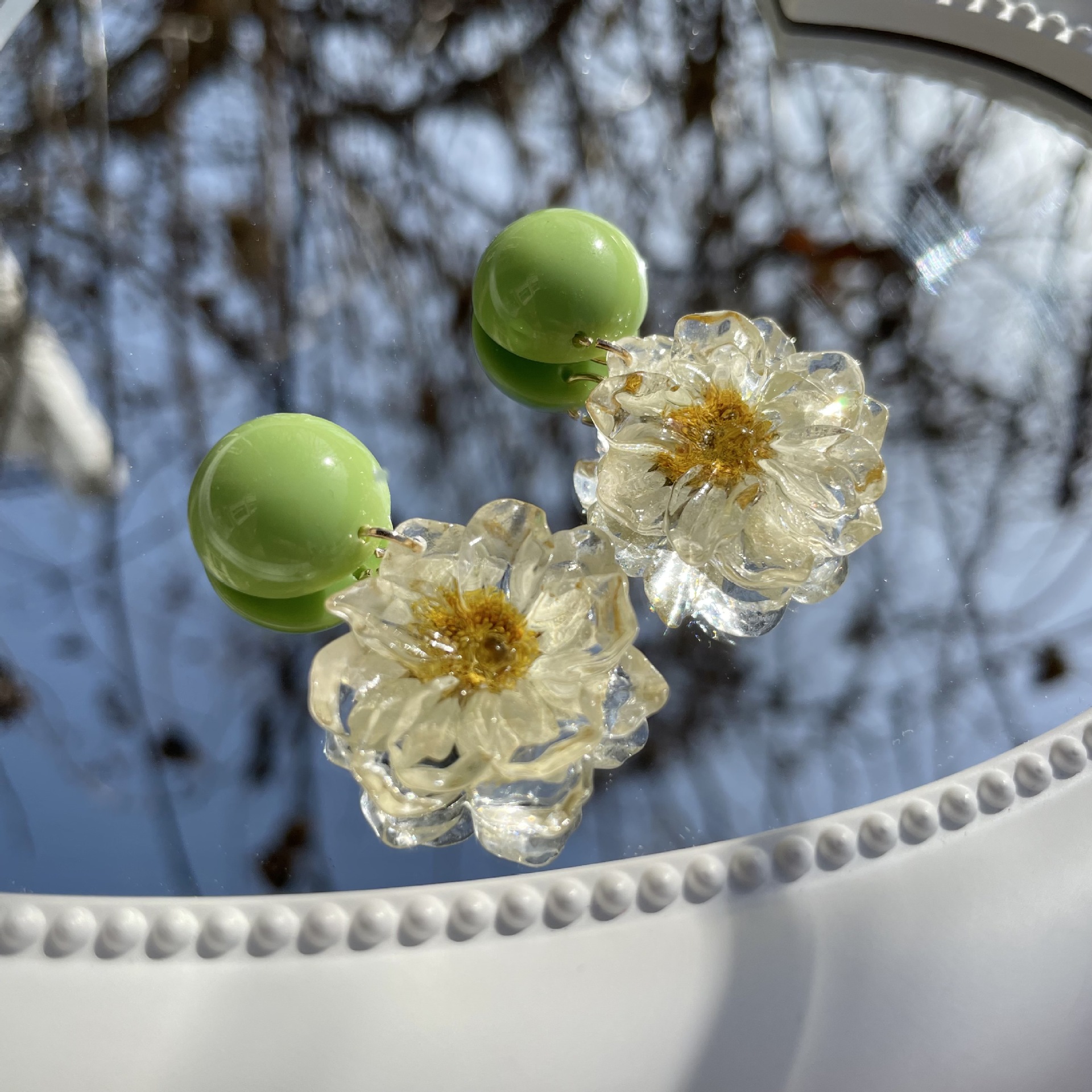 Spring and Summer Daisy Flower Earrings Japanese New Style White Dried Flower Transparent Ice Cube Sense Earrings Fresh Green Female Ear Clip