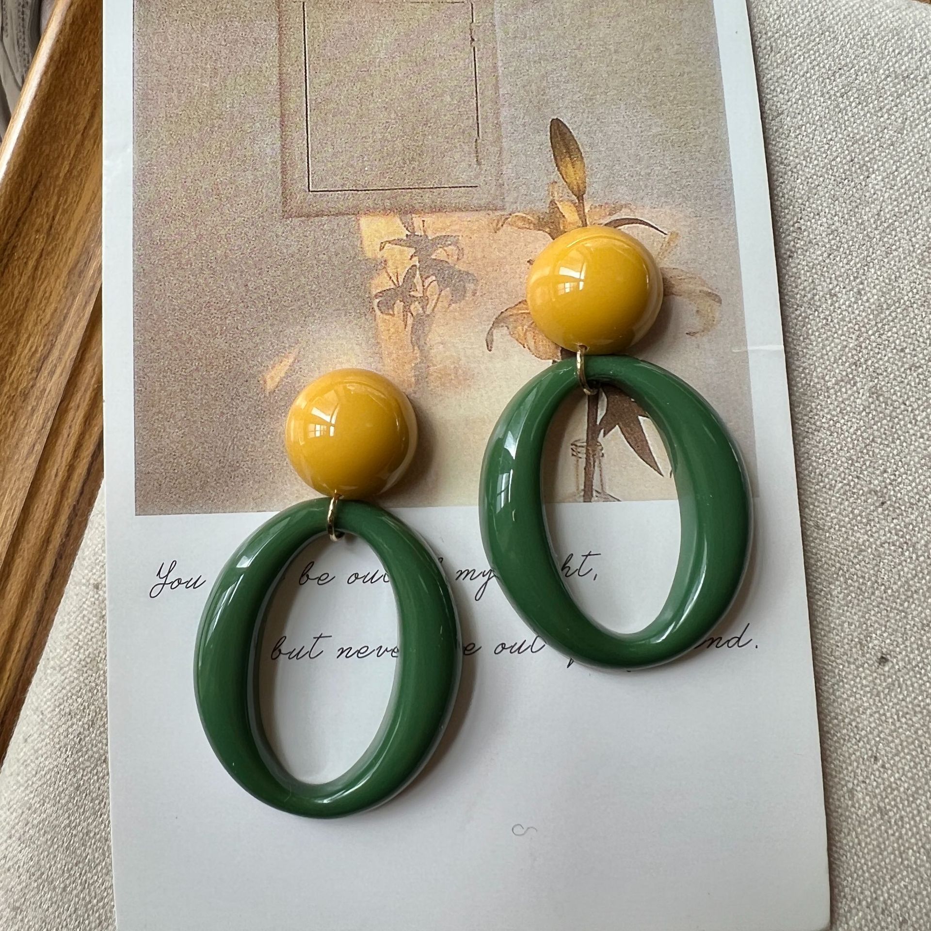 Retro Hong Kong Style Atmosphere French Oil Painting Yellow Green Contrast Color Exaggerated Geometric Oval Earrings Earrings Women's Earrings