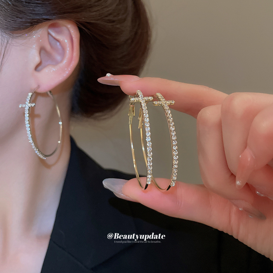 Silver Needle Diamond Cross Round Ear Ring European and American Retro Fashion Elegant Piece Ring Earrings Light Luxury High-end Earrings for Women