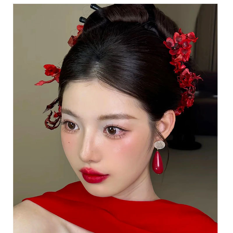 Retro Hong Kong Style Beauty Age Sense Internet Red Water Drop Wine Red Resin Earrings Blogger Same Earrings Women Red