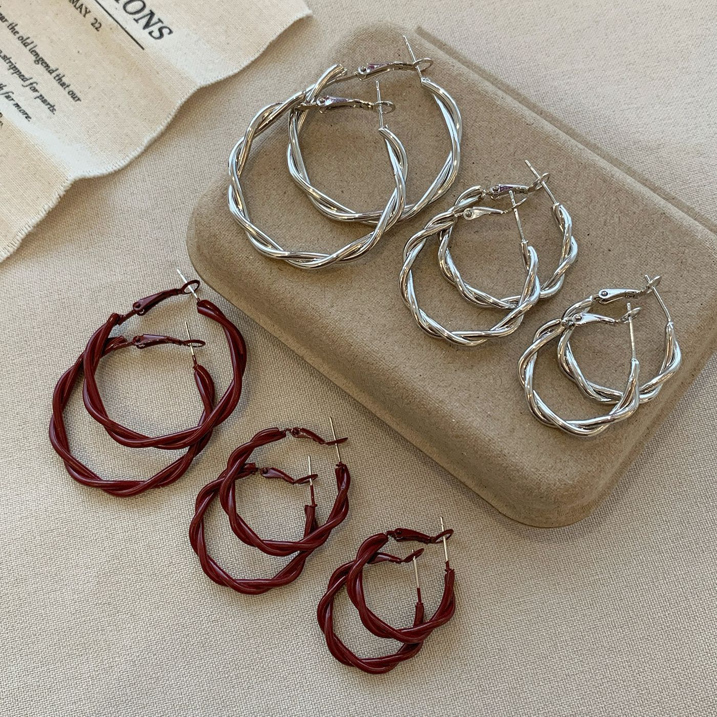 New Style Simple Atmospheric Red Ring Twist Earrings Silver Needle Women's Ins Exaggerated Daily All-match Cold Wind Earrings